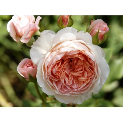 Когда бутон распускается, густомахровый цветок принимает чашевидную форму с плотной структурой. Крупная роза состоит из 100-120 бархатистых лепестков, которые плотно прилегают друг к другу. Диаметр розы варьируется в пределах 8-10, иногда 12 сантиметров. Окрас может быть нежно-розовым с персиковым отливом. Иногда встречаются английские розы Вильям Моррис абрикосового или перламутрово-розового цвета, который под солнечными лучами становится более светлым и немного выгорает. Невероятно красивые цветы издают яркий аромат с чайными нотками. Стоит отметить, что из всех роз английской селекции у этого вида аромат самый интенсивный.